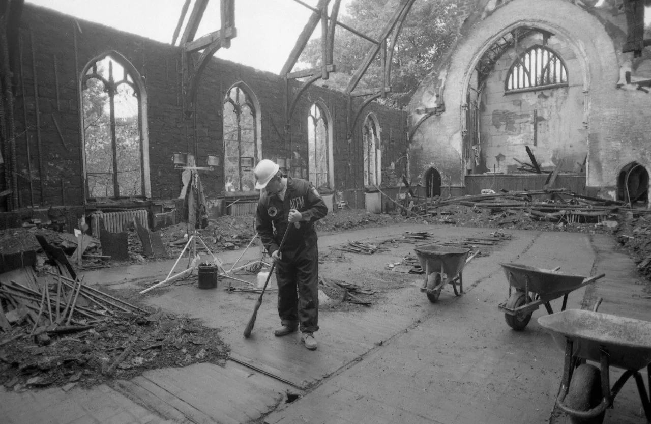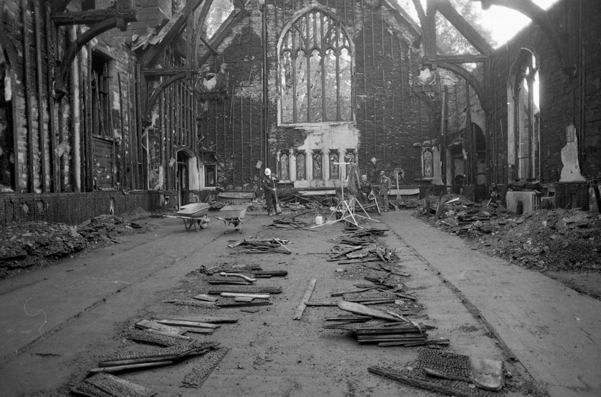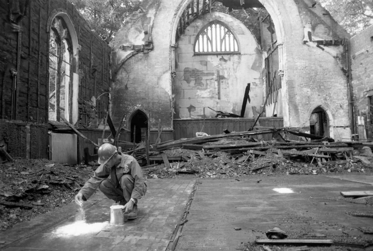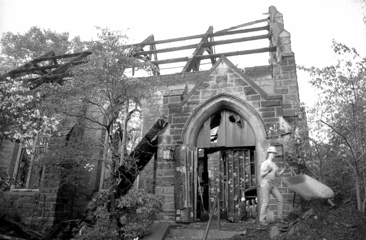 Nearly two years after the arson fire destroyed the building, the charred walls were torn down. The demolition took about one month, first removing debris and then pulling down the stone walls. The lot was cleared and stayed empty while the long-range planning committee studied the situation and made recommendations to the congregation.