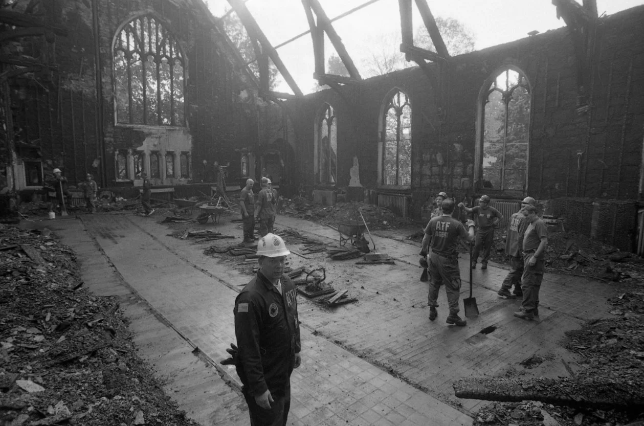 Within days, a team of investigators from the Bureau of Alcohol, Tobacco and Firearms (ATF) began sifting through the debris. Intense heat had charred the wooden floors in the Sanctuary and the slate roof collapsed as far down as the lower level in some places. Pews were disintegrated, leaving rows of ashes and scorched planks. Damage was estimated at more than $4 million. The ATF determined that an arsonist was responsible for the inferno since accelerant was detected, but to this day the question of who started the fire remains unanswered and no arrests were ever made. Elements of the church can still be found – Woodland’s bell, cornerstone and four stone windows were incorporated into a future addition to the Worship Center. Workers helped recover a Bible and hymnal. On November 3, 1991, members of the church as well as people from the community gathered for a candlelight service of remembrance.
